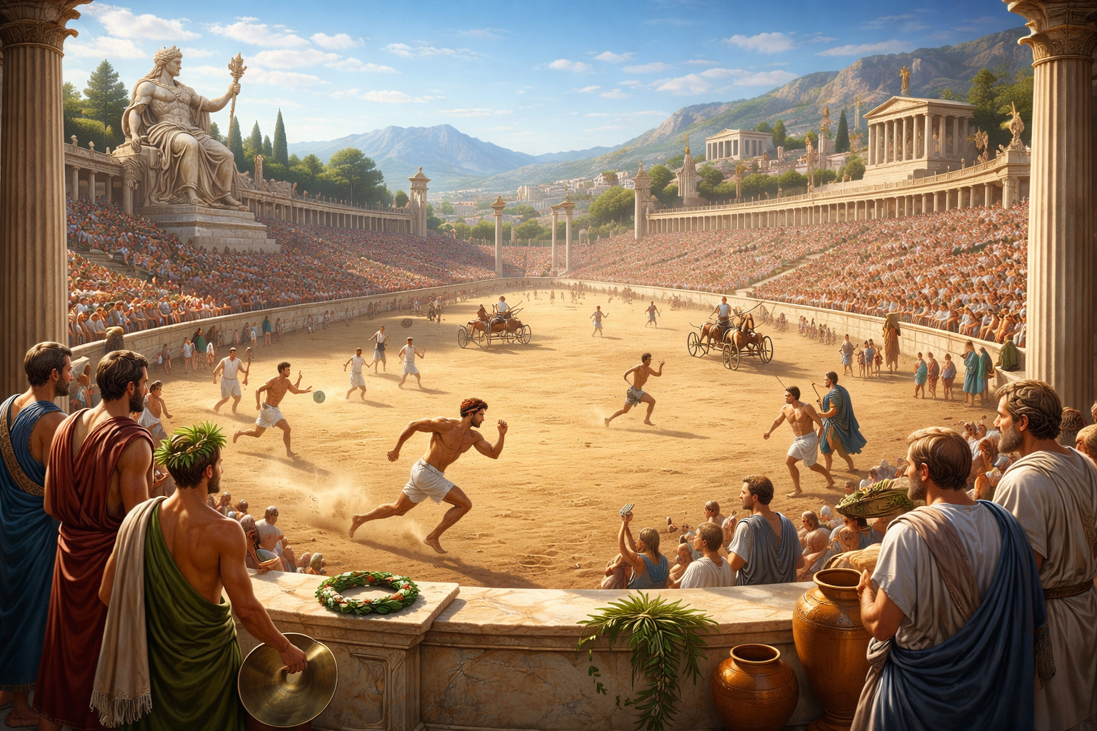 Het Oude Griekenland: De Grieken gaven sport een formele vorm. In 776 v.Chr. vonden de eerste Olympische Spelen plaats in Olympia. Sport werd hier gekoppeld aan religie en eerbetoon aan de goden.